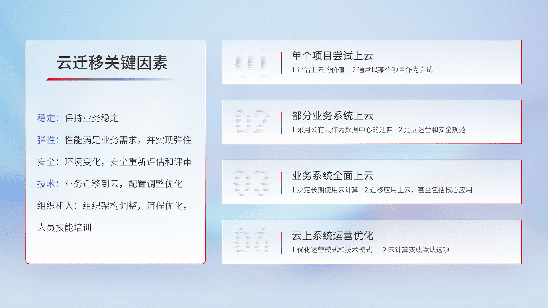 结合实际业务,,从规划设计、、云平台选型、、、云原生改造、、、、数据迁移、、集成交付,,,迁移全过程为客户识别最佳上云路径,,做好风险识别管理,,设计网络架构、、、身份权限、、、、安全审计合规、、、操作审计、、、、日志审计、、监控告警策略、、多站点容灾设计等,,对云上基础设施进行整体规划,,,提升IT治理水平,,,以满足弹性、、、高可用、、、高性能的需求。。。