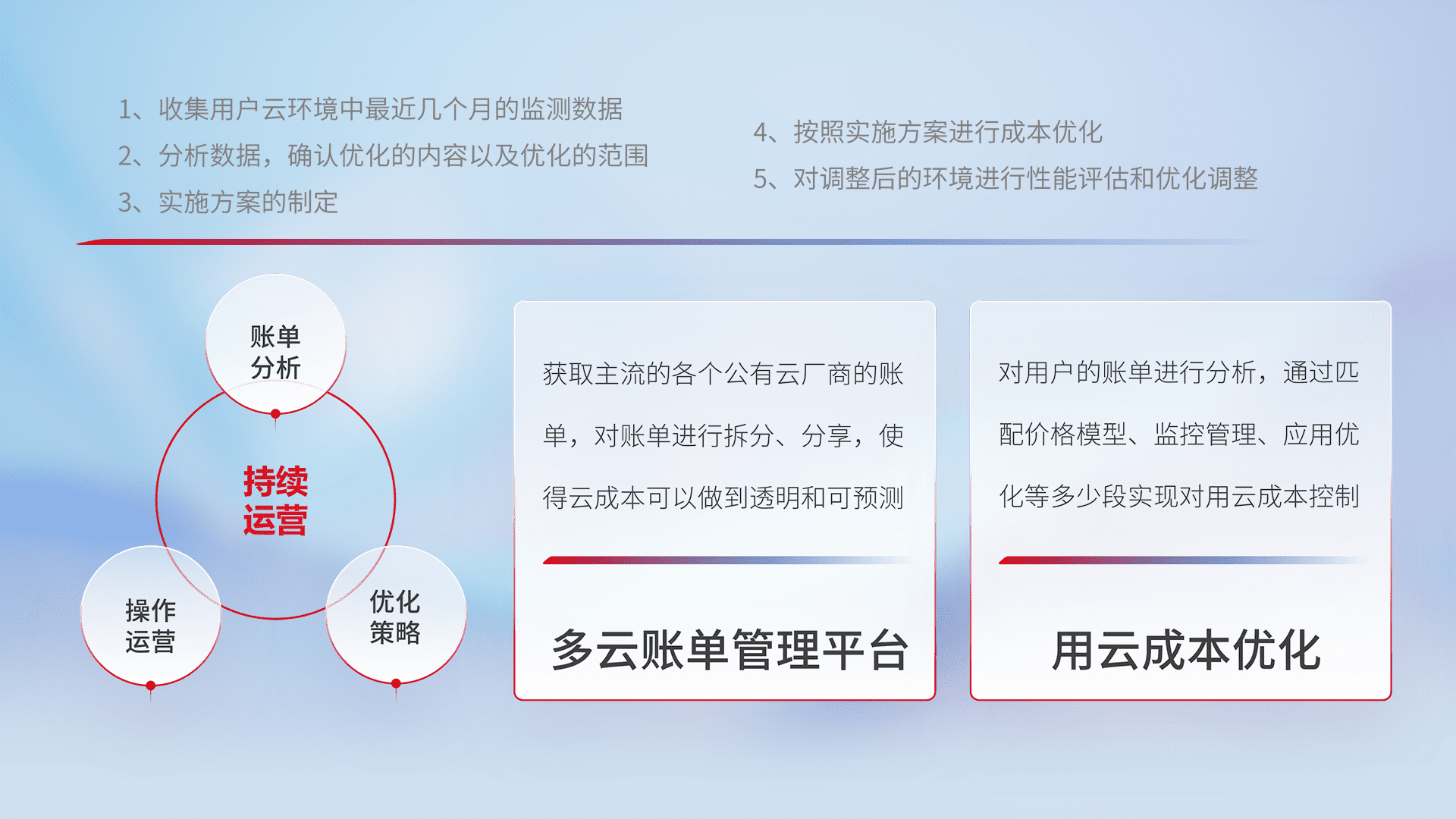 通过多云纳管,,,,以统一的资源数据模型把客户的云资源进行抽象和封装,,进而实现对多云资源的统一操作,,保障云资源管理的可靠性、、、稳定性与可用性。。。。量身定制化运维内容,,,,配置、、、、开发运维、、、补丁管理、、、、备份、、监控、、、认证和访问管理、、、审计和日常巡检等,,保障在用云过程中的可靠度,,,,稳定度以及高可用率。。。。
